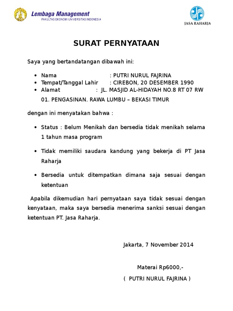 Surat Penyataan Bersedia Tidak Menikah / Surat Pernyataan Belum Menikah Dan Sanggup Tidak Menikah Ppg Sm3t - Naskah soal dan pembahasan usm stan 1999 2008 edisi revisi